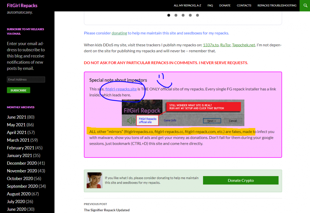 This site, fitgirl-repacks.site is THE ONLY official site of my repacks. Every single FG repack installer has a link inside, which leads here.
